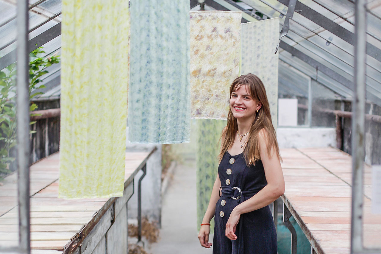 Um optimale Resultate zu erhalten und die Aufnahmefähigkeit zu erhöhen, hat die Textildesignerin ihre Stoffe stets umfassend behandelt. Dazu werden diese erst gewaschen, um sie sodann mit Kaliumalaun zu behandeln. Dadurch werden die Stoff­fasern poröser, wodurch die Farbe später besser haftet. Als Nächstes werden die Blüten in die Tücher gewickelt, wird das Ganze mit Essig behandelt und anschliessend gedämpft.