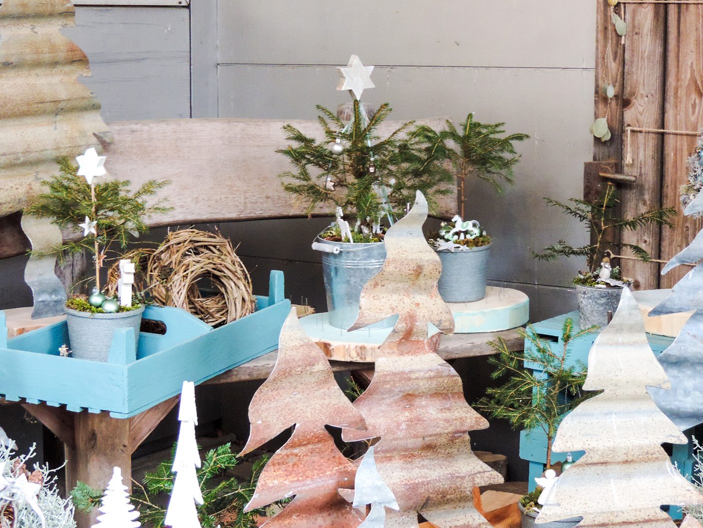 Aus Holzresten werden nach entsprechender Bearbeitung die unterschiedlichsten Sterne. Alte Konservenbüchsen dienen als Basismaterial für Sterne, Engelsflügel und Tannenbäume. Die moderne Farbe Salbeigrün gibt der neuen Kollektion ein besonderes Aussehen.