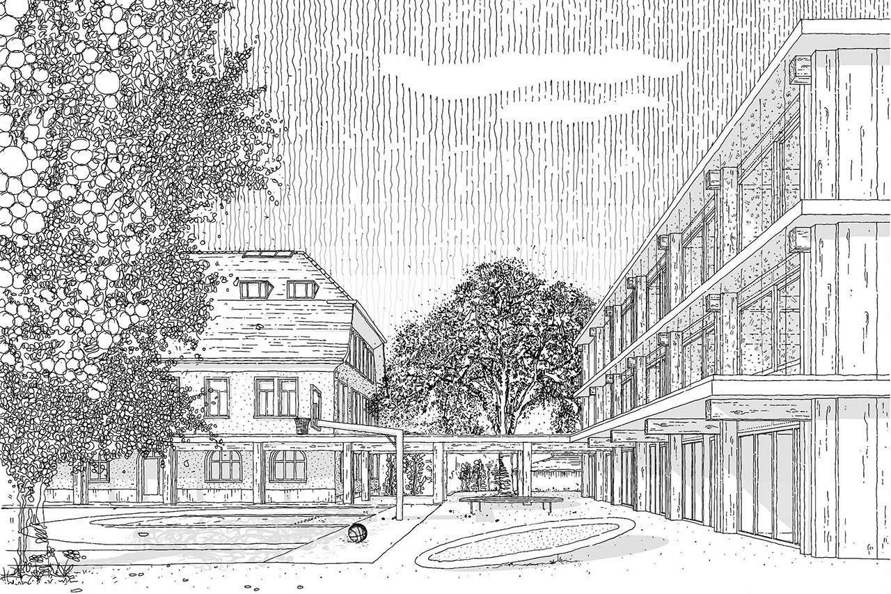 Der neu abgesenkte zentrale Pausenhof ist Eingangsort für die Schulhäuser. Im Neubau werden die Kindergärten und die Klassenzimmer angeordnet. Die Korridor- und Verkehrsflächen lassen sich hier flexibel für vielfältige Aktivitäten nutzen. Auf den Altbau werden die Tagesstrukturen, das Textile Technische Gestalten und andere Räume verteilt.