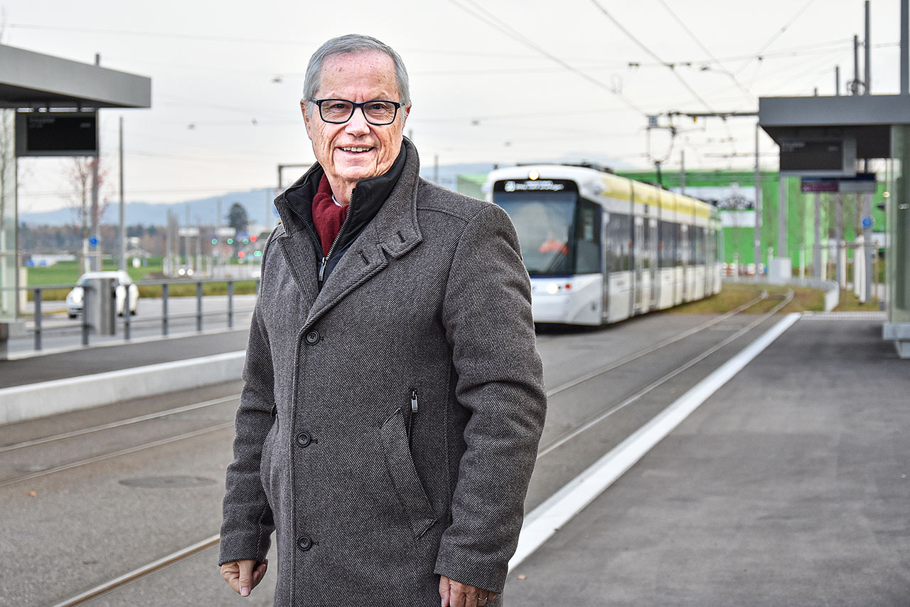 Schöner Zufall: Beim Fototermin mit Markus Mötteli im «Kreuzäcker» naht ein LTB-Tram auf Testfahrt. (Bild: is)