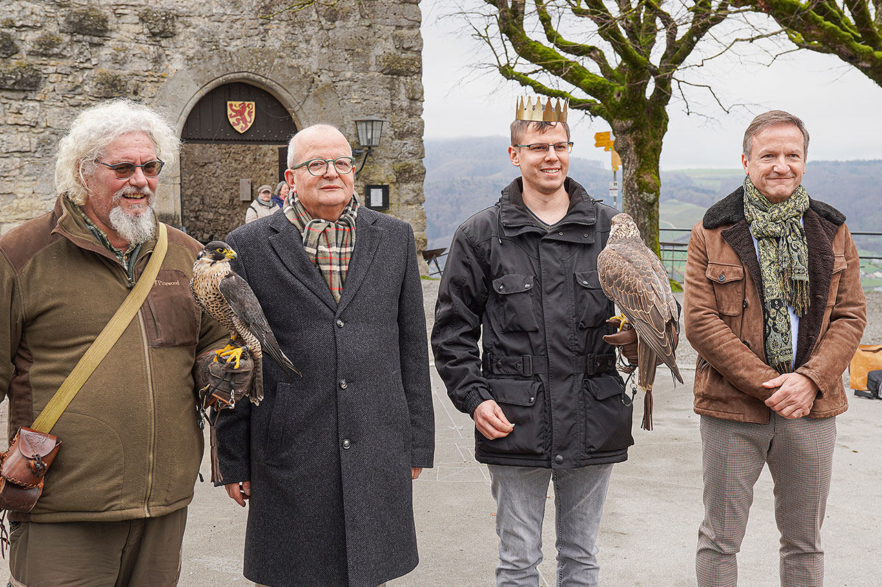 Falkner Ulrich Lüthi, Gemeindeammann Werner Rüegsegger, König Karsten Nied mit Baronesse und Museumsdirektor Marco Castellaneta vor dem Schloss Habsburg. (Bild: cd)