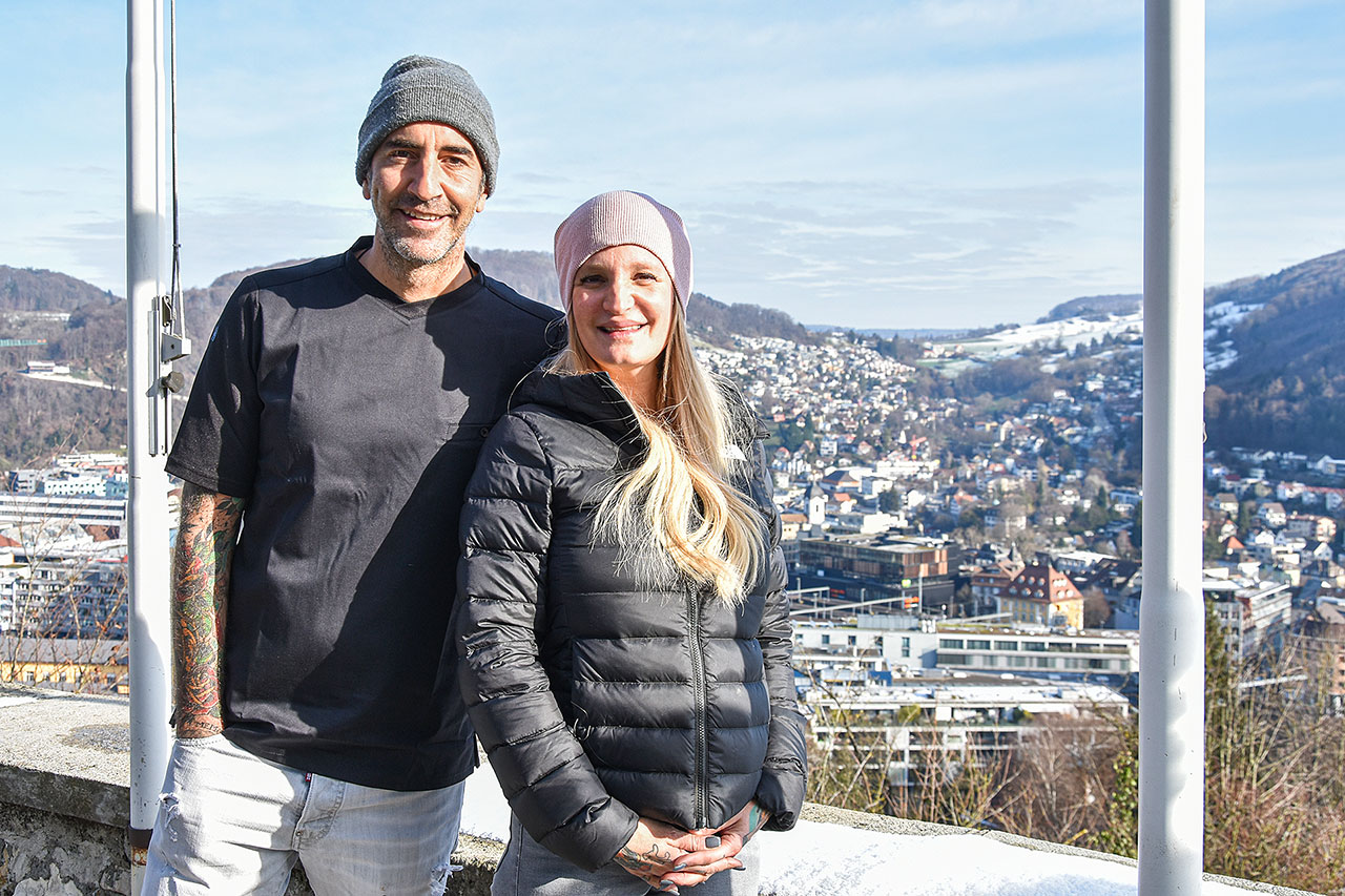 Nicole Brack und Gian Riederer stehen auf der Terrasse ihres Restaurants «Belvédère», von der man über die ganze Region bis nach Zürich und in die schneebedeckten Voralpen blicken kann. «Hier sass ich als Kind oft mit meinem Grosspapi, denn meine Mutter hat hier in den 1980er-Jahren im Service gearbeitet. Er rauchte Zigarre und jasste, und für mich gabs Sirup und Chips», erinnert sich die 46-jährige Ortsbürgerin mit glänzenden Augen. Auch der gebürtige Toggenburger Riederer fühlte sich dank der Lage des «Belvédère» sofort zu Hause. «Ich bin einfach gern in der Höhe und brauche den Weitblick irgendwie», sagt der Spitzenkoch, der in den letzten fünfzehn Jahren das Restaurant Schloss Schartenfels in Wettingen geführt hat. Und Nicole Brack ergänzt lachend: «Sogar das Hotel in der Karibik, das du mit deiner Schwester hattest, stand auf einem Hügel.»