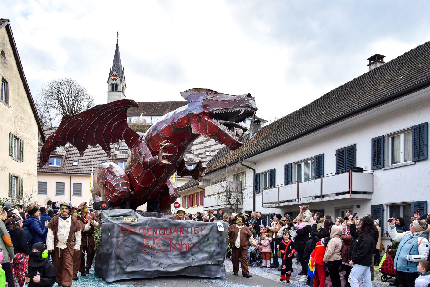Drei Jahre mussten die Fans der Würenlinger Fasnacht auf diesen Moment warten: Am Sonntag um 14 Uhr setzte sich der grosse Umzug mit 41 Wagenbau-Gruppen und Guggenmusiken in Bewegung. Ein Highlight war der bewegte Drache des «Breitenquartiers», der Rauch und Feuer spuckte. (Bild: is)