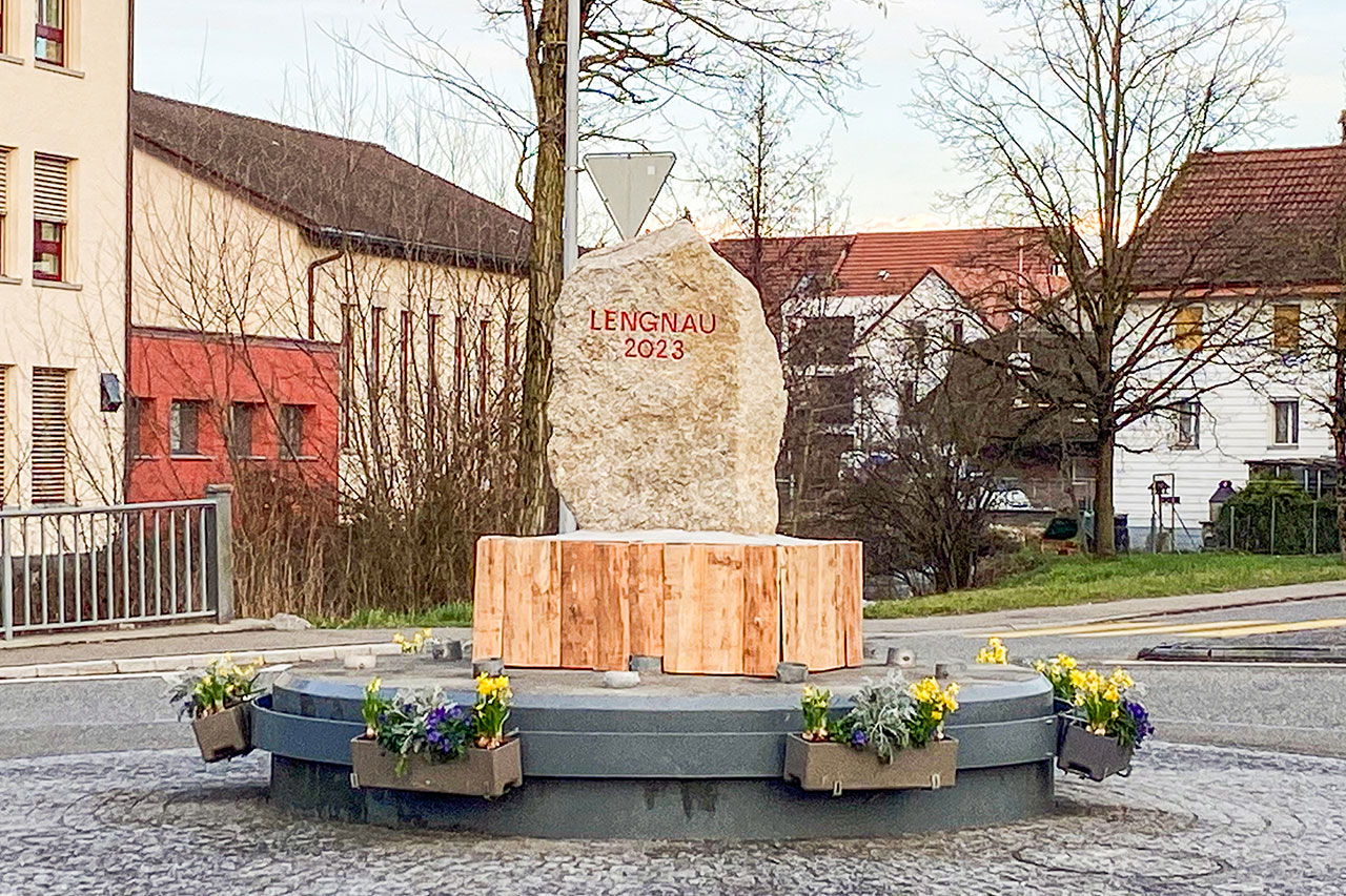 Genau 100 Tage vor Festbeginn wurde am Dienstag, 16. März, der 800 Kilogramm schwere Jubiläumsstein mitsamt seinem 200 Kilogramm schweren Sockel mitten im Kreisel an seinen endgültigen Bestimmungsort gesetzt. Trotz Regenwetter kamen zahlreiche Schaulustige an den Anlass. Sie bekamen ausserdem drei kurze Kostproben des Festspiels mit Figuren aus dem 18. Jahrhundert, einem Schimmel (Lengnauer Gemeindewappen) sowie einem Pfarrer und einem Juden zu sehen, die sich am Dorfbrunnen unterhielten. Den Festakt begleiteten 15 Alphornbläser, darunter auch OK-Präsident Kurt Schmid.