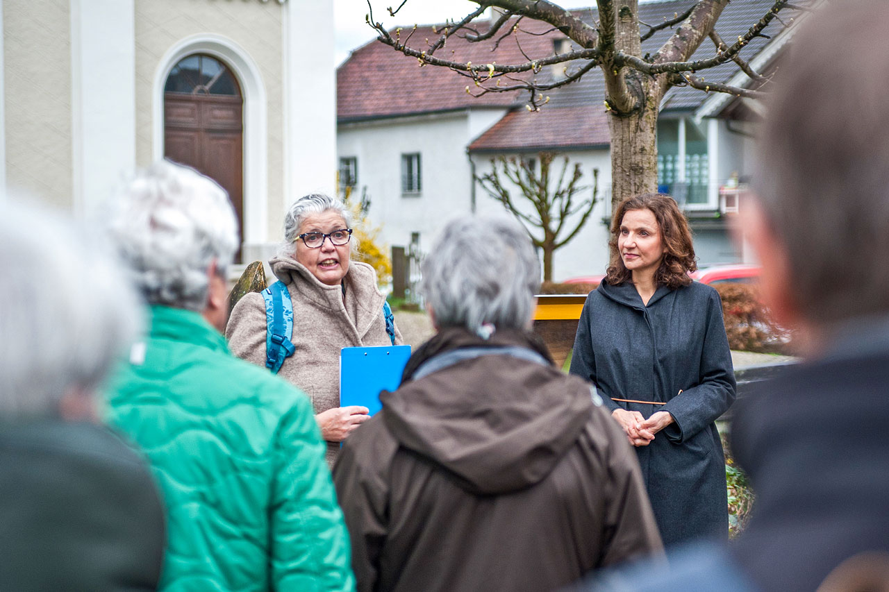 Lydia Spuler schildert SP-Nationalrätin Gabriela Suter und ihren Gästen die Geschichte der Lengnauer Juden und stellt das Projekt Doppeltür vor. (Bild: BKR)