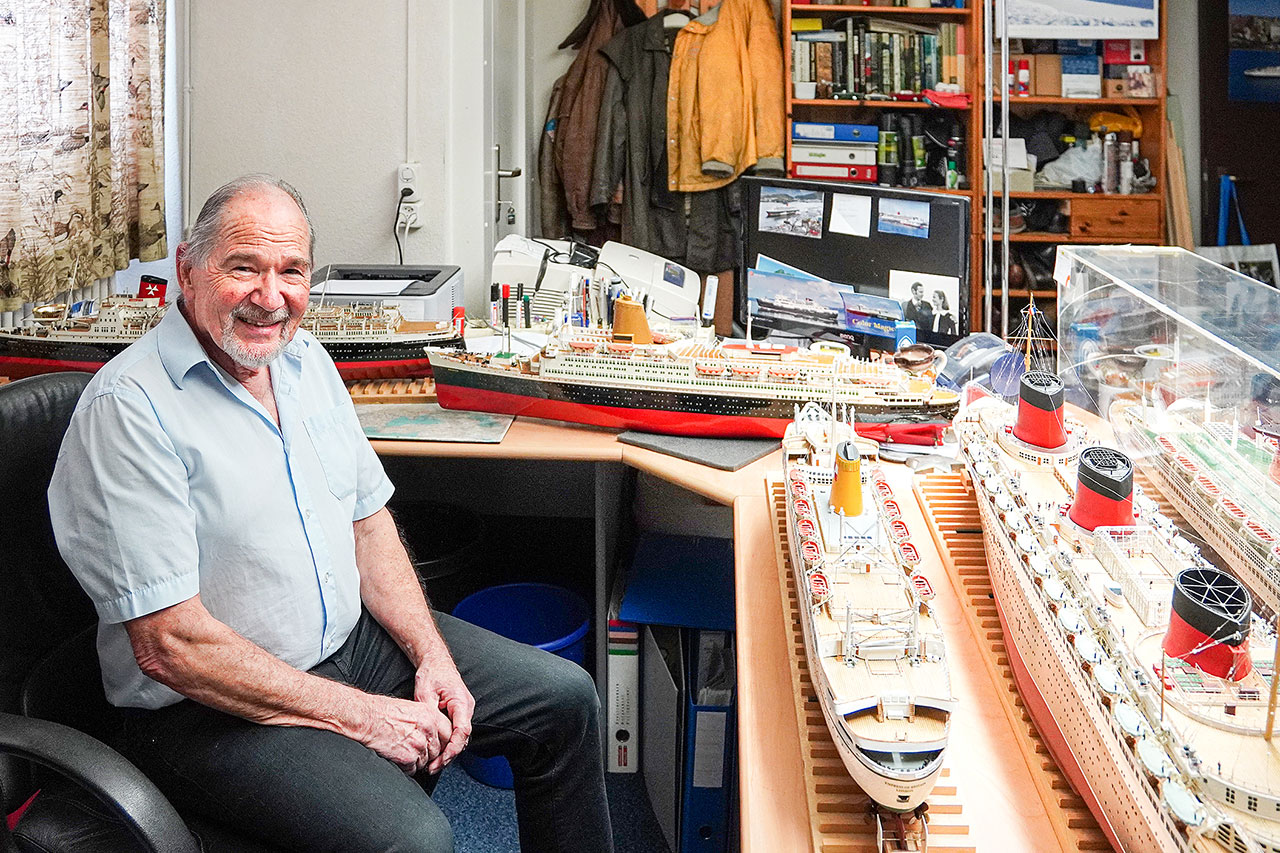 An den Moment, in dem es um ihn geschehen war, erinnert sich Gerold Brunner ganz genau. Es war Liebe auf den ersten Blick und der Beginn einer grossen Leidenschaft, als er das italienische Passagierdampfschiff «An­drea Doria», Baujahr 1952, zum ersten und einzigen Mal in Genua sah. Als das Schiff 1956 nach einer Kollision sank und die Zeitungen über das Drama berichteten, war der damals 12-Jährige fassungslos. «Sie war eines der allerschönsten Schiffe der Welt», sagt der 78-Jährige. Auf den Reisen mit seinen Eltern in die Niederlande, nach Dänemark und Norddeutschland sah er als Jugendlicher andere Passagierschiffe – und war zunehmend fasziniert von deren Eleganz, Formschönheit und Ästhetik. Der Modellschiffbauer nennt diese Kriterien bis heute als ausschlaggebend dafür, dass er sich seinem Hobby mit Haut und Haar verschrieb. Jedes Mal, wenn er ein Passagierschiff erblickte, prägte er sich die opulenten Details ein, liess sich von der Charakteristik verzaubern, sammelte umfangreiches Wissen darüber und begann, die Schiffe nachzubauen, die er in den grossen Häfen hatte liegen sehen.