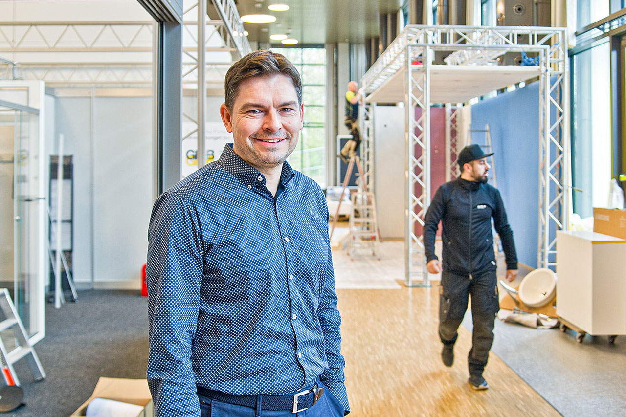 Marco Biland, Geschäftsführer der ZT Fachmessen AG, fotografiert am Montag während des Aufbaus von Bauen + Wohnen im Wettinger Tägi. (Bild: bkr)