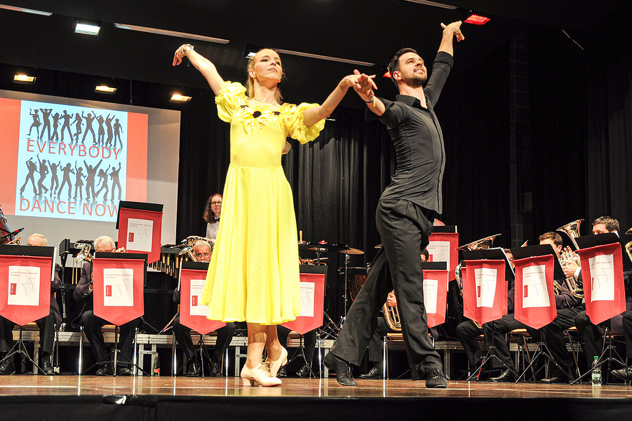 Am Wochenende brach in Lengnau das Tanzfieber aus. Am Samstagabend sowie am Sonntagnachmittag lud die MG Brass Band zum Unterhaltungskonzert. Unter der Leitung von Markus Hauenstein aus Endingen, der mit viel Gefühl dirigierte, «tanzte» die Band brillant rund um die Welt. Mit dem Motto «Everybody dance now» animierte das Orchester die Zuschauerinnen und Zuschauer schon fast zum Mittanzen – aufgrund des beschränkten Platzes auf jeden Fall zum Mitwippen. Nach dem «Armenian Fire Dance» zum Auftakt ging es mit einem ungarisch inspirierten Tanz von Johannes Brahms, dem weltberühmten «Tanz Nummer fünf», weiter bis zu einem jamaikanischen Rumba. Moderator Erhard Wyss schwelgte dabei in Erinnerungen an Zeiten, als er selbst einen Tanzkurs besuchte.