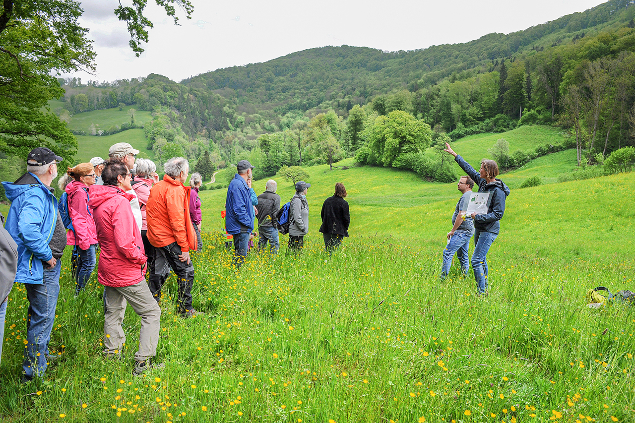 Über Vernetzung referierten Barbara Finkenbrink und Dany Amstutz aus der Landschaftsschutzkommission. Auf einem Hügel östlich von Ehrendingen erläuterte Finkenbrink die verschiedenen Ebenen ökologischer Infrastruktur – grüne, gelbe, blaue und dunkle. Grün sind Wälder, Hecken und Bäume. Gelbe Ebenen sind Wiesen, Ruderalflächen, Weiden und Buntbrachen.