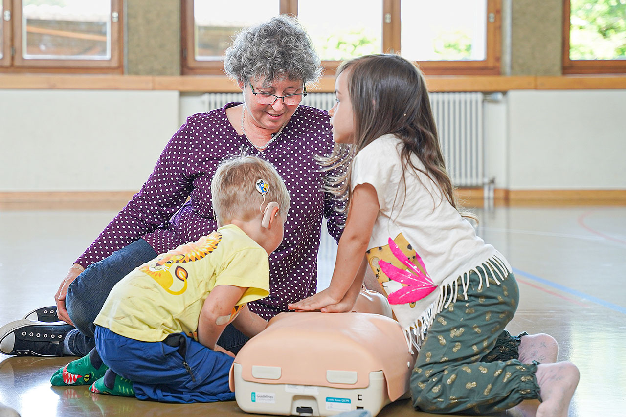 Der Start in den Tag erfolgte gemeinsam – mit dem «Blaulicht-Fahrzeug-Lied» nach der Melodie von «Det äne am Bärgli». «So wurde der Zusammenhalt zwischen den Altersstufen gestärkt», erzählt Martin Riegger. Danach lernten die Kinder bei ihren Klassenlehrpersonen auf indiviuelle Art und Weise, was in einem medizinischen Notfall zu tun ist.