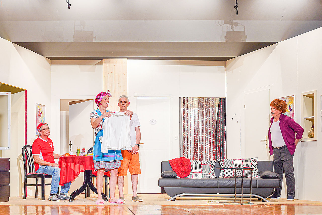 «Das bisschen Haushalt ist doch kein Problem, sagt mein Mann», singt Andrea Maurer (Andrea Huwyler) augenrollend. Energisch schmeisst sie die herumliegenden Kleidungsstücke in den Wäschekorb. Dann reicht es ihr endgültig, der Wäschekorb landet mit einem lauten Knall auf dem Bühnenboden, und Andrea Maurer verlässt türenknallend das Wohnzimmer. Der Vorhang fällt, und Regisseurin Janine Hauser tritt auf die Bühne, um die Begrüssung des Publikums zu üben.