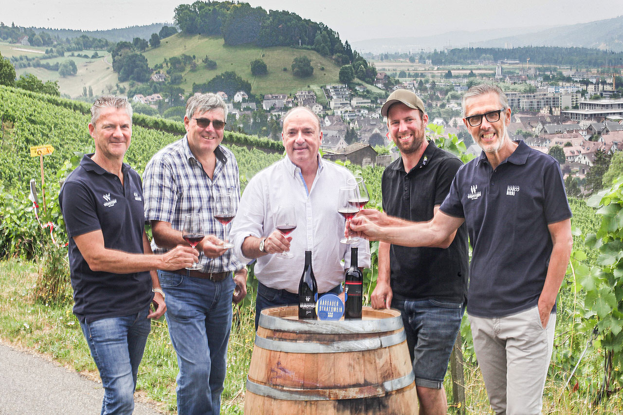 Wettinger Winzer stossen mit dem Landstatthalter Markus Dieth (Mitte) auf die Aargauer Staatsweine aus Wettingen an. (Bild: sim)