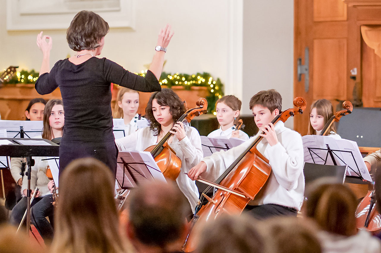 An der Musikschule Brugg wird der Nachwuchs gefördert: Irene Bütler dirigiert das Orchestra della scuderia am Adventskonzert der Musikschule 2022 in der Stadtkirche Brugg (BILD: zVg | Createc, Beat Kaufmann)