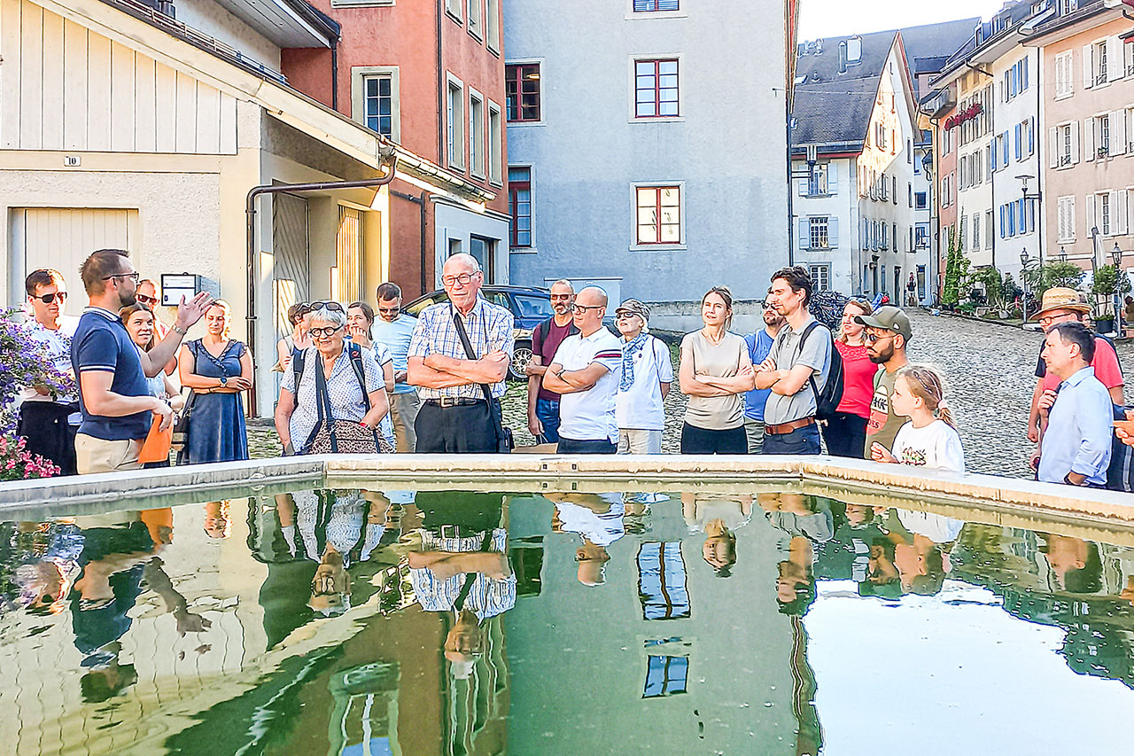 Eine Gruppe lauscht beim Hofstattbrunnen interessiert den Ausführungen von Titus Meier. (Bild: mw)