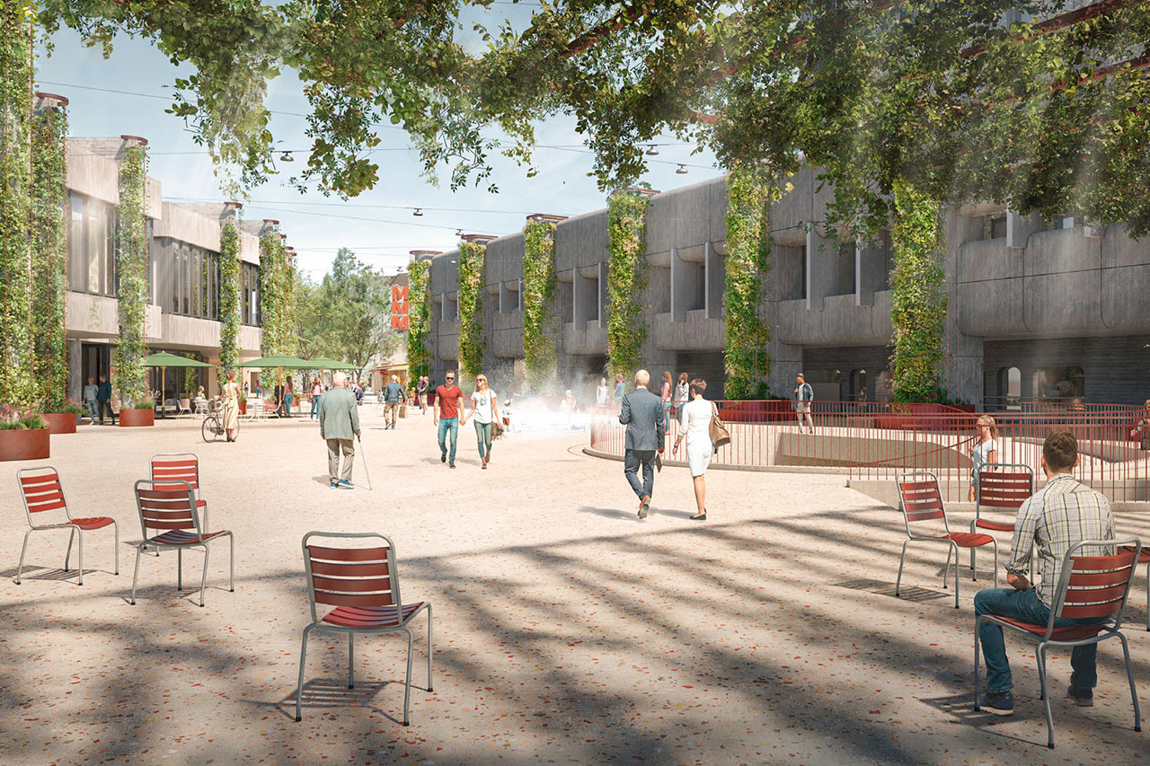 So sähe der Neumarktplatz mit freigelegtem Abgang, hellem Gussasphalt und Begrünung aus. (Visualisierung: zVg | Nightnurse Images AG)