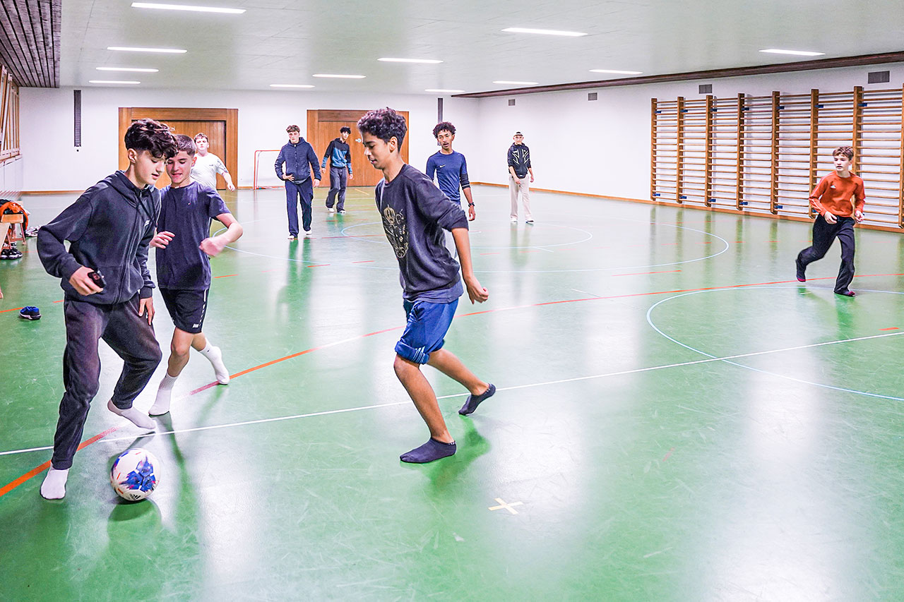 Zielsicher steuert ein Spieler auf das Tor zu, nimmt den Ball dabei gekonnt am Fuss mit. Nicht einmal, als ein anderer Junge in die Beine des Spielers grätscht, lässt er sich aus der Ruhe bringen. Mit einem harten Schuss befördert er den Ball ins Tor. Jubelrufe und Pfiffe ertönen, der Torschütze dreht eine Runde und breitet dabei siegessicher die Arme aus. Deutschrap dröhnt aus den Lautsprechern. Die meisten der etwa 20 Jugendlichen haben aufgrund des Strassenschuhverbots in der Halle Socken an, wodurch immer wieder einer ausrutscht. Doch das hält sie nicht von waghalsigen Manövern ab, um den Ball ins Tor zu befördern. Mannschaften gibt es keine.