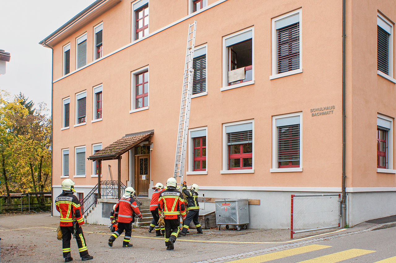 Wenn Personen eine Gefahrenzone nicht über reguläre Fluchtwege verlassen können, erfolgt die Rettung über die Leiter. Am Schulhaus Bachmatt zeigte sich, wie wichtig es ist, den Leiterfuss richtig zu platzieren und durch entsprechendes Verlängern den Ausstiegmöglichkeiten anzupassen. Grosses Augenmerk wurde auf eine fachgerechte Brust- oder Rückenbindung sowie die Hilfe beim Einstieg auf die Leiter der zu rettenden Person gelegt. Hier zeigte sich in der Besprechung, dass es stets Alternativen und Verbesserungen gibt.
