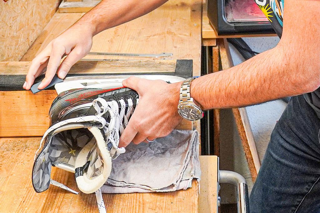 Severin Tröschs Lehrmeister Robin Bauer, ein ehemaliger Eishockeyprofi beim EHC Kloten und den ZSC Lions, brachte ihm während der Ausbildung ein ganz besonderes Handwerk bei: das Schleifen von Schlittschuhkufen. Geschäftsinhaber Trösch hat die Auswirkungen der Digitalisierung auf dieses Fachgebiet miterlebt: «Früher war es ein reines Handwerk, das Erfahrung und Wissen voraussetzte.» Der stetige Austausch mit den Athleten sei geblieben, selbst wenn der Kufenschliff heute zum grössten Teil von Maschinen ausgeführt werde. Was zudem geblieben ist: Der letzte Schliff am Schluss wird der Kufe von Hand verpasst.