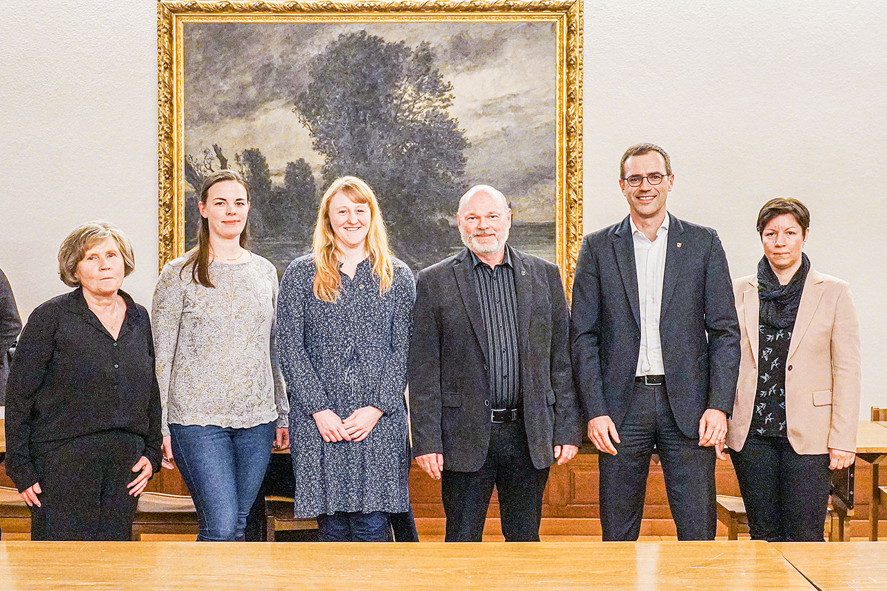 Einwohnerratspräsident Markus Lang, GLP (3. von rechts), eingerahmt von den neuen Ratsmitgliedern. (Bild: cd)