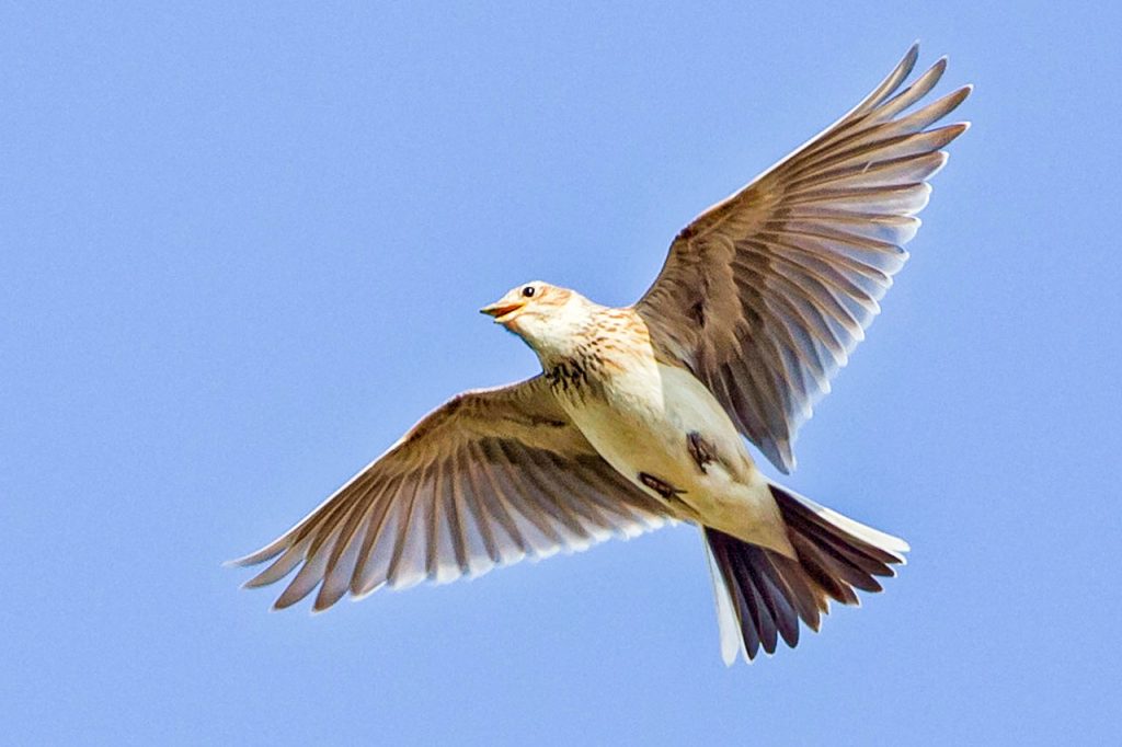 Eine Feldlerche bei ihrem melodiösen Singflug. (Bild: bhe)