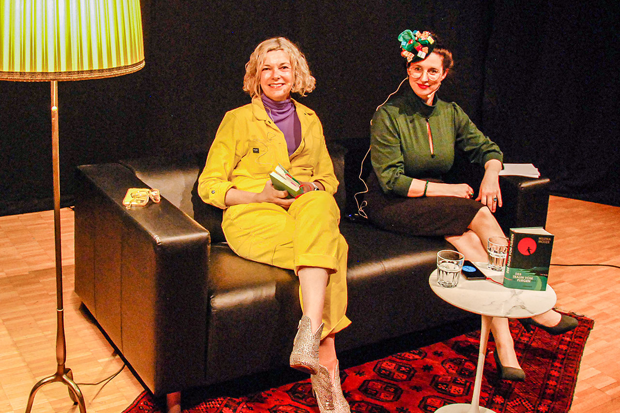 Die Autorin Milena Moser mit der Literaturwissenschaftlerin Julia Knapp bei der Lesung in der Aula Unterboden. (Bild: ejo)