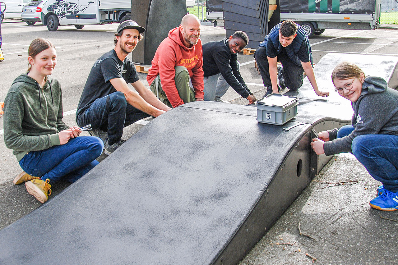 Unter Anweisung von Fabio Jungen (rechts) baute das Helferteam vom Jugendnetz den Pumptrack zusammen. (Bilder: ejo)