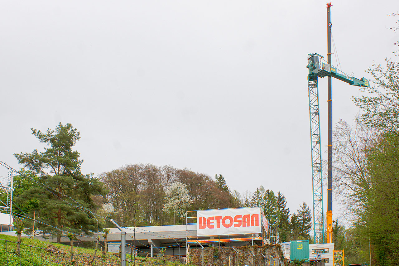 Als das Fundamentkreuz auf dem Fundament befestigt war, wurden die einzelnen Turmteile mittels eines grossen Pneukrans zusammengebaut. Um die moderne Aussenkabine zu befestigen, die der besseren Übersicht über den Arbeitsbereich dient, stiegen zwei Monteure in schwindelerregende Höhe. Damit die Standsicherheit gewährt ist, wurde vorgängig im Sockelbereich der Betonballast aufgeschichtet. Den Abschluss der Kranmontage, die bei guten Witterungsverhältnissen ausgeführt werden konnte, bildete die Montage des Auslegers.