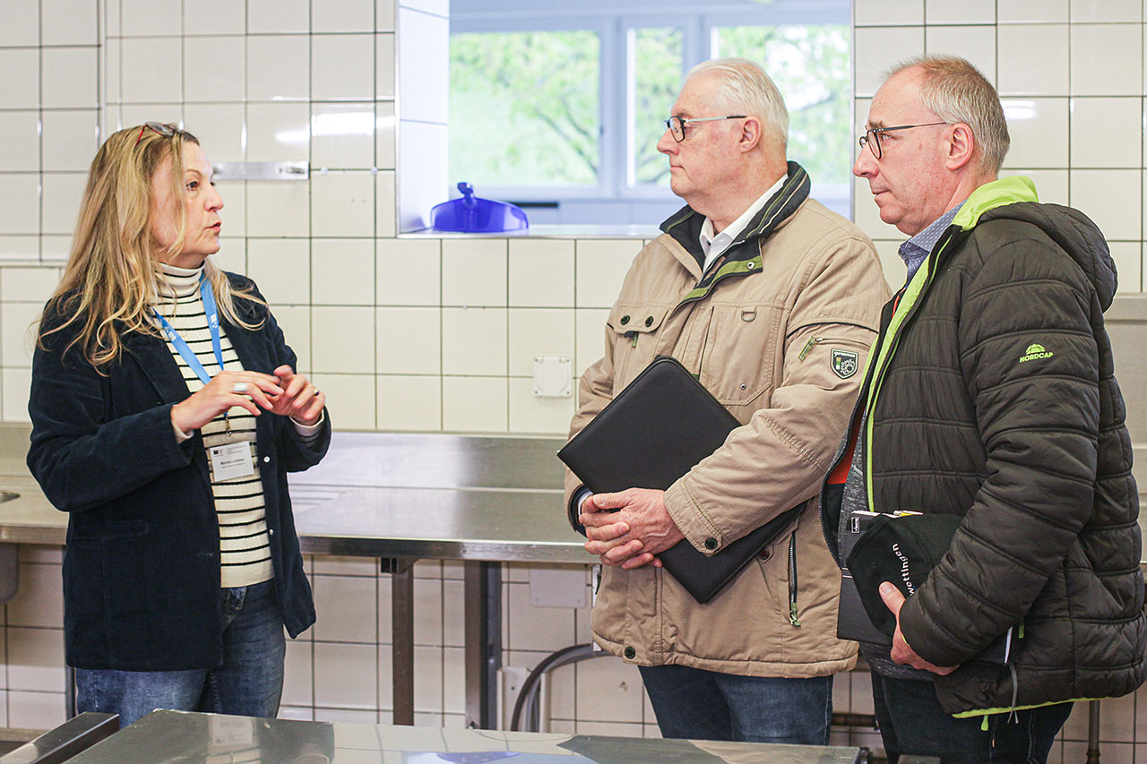 Monika Lindner erläutert Gemeindeammann Roland Kuster und Gemeinderat Markus Haas das Küchenkonzept. (Bild: sim)