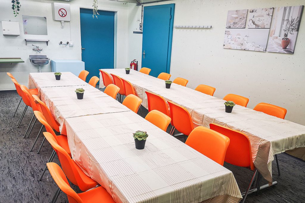 Unten führten Vertreterinnen und Vertreter des Kantons und künftige Sicherheitsleute von der Securitas AG durch die Räumlichkeiten, die sich im Vergleich zu vorher deutlich wohnlicher zeigten: Neben einem Entree mit Empfang, Betten mit Schränken, gedeckten Tischen, einer Waschküche, zwei Aufenthaltsräumen mit Töggelikasten und Sofas sollen Kunstpflanzen, Bilder, Leuchtgirlanden und bunt gestrichene Wände für eine gemütlichere Atmosphäre sorgen. Weil es in der GSS keine Kochgelegenheit gibt, werden die Bewohner drei Mal täglich von einem Catering verköstigt (die «Rundschau» berichtete).