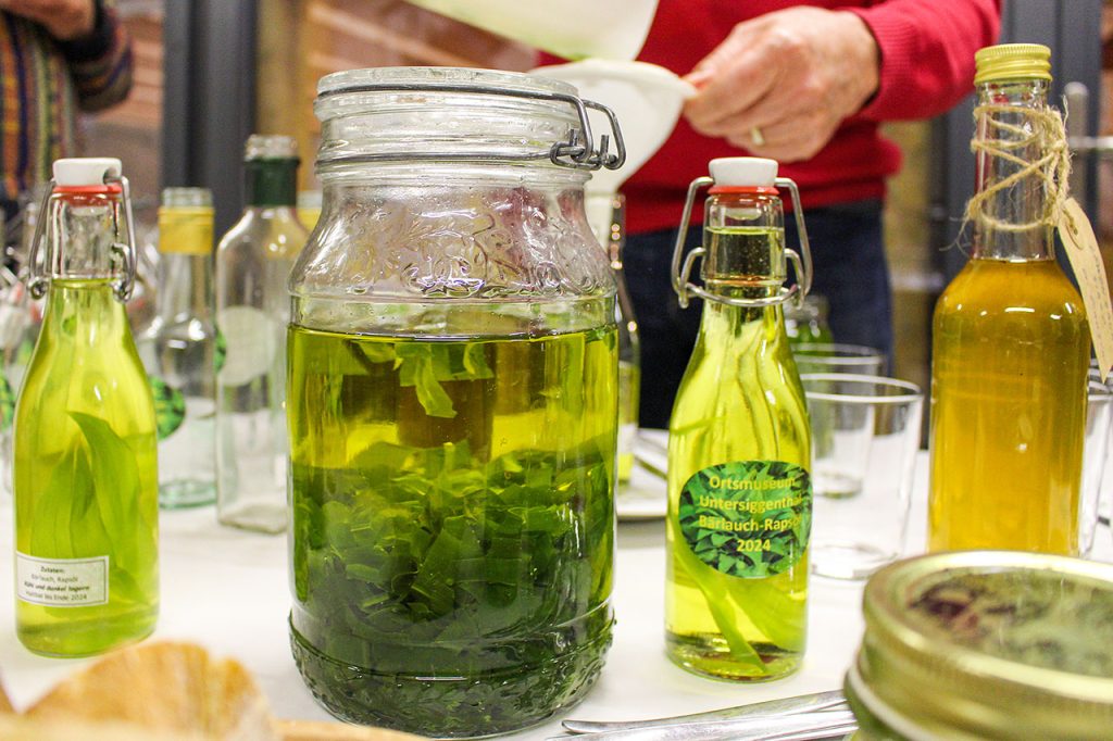 Nicht nur Eier wurden konserviert: Man kochte Konfitüren, Sirup, verwendete dazu Früchte aus dem Garten, auch das Gemüse wurde eingelegt. Und man blickte über den Gartenrand: Wald und Feld gaben Bärlauch, Löwenzahn und Nüsse. Franz Umbricht (78) demonstrierte gekonnt das Verfeinern von Öl mit eingelegten Bärlauchblättern, Marlen Hitz (80) stellte nebst Randensalat auf Vorrat (eingelegt in Essig mit Gewürzen) einen ausserordentlich feinen Löwenzahnsirup vor und gab einen Tipp für Holundersirup: «Den besten Sirup erhält man, wenn man die Blüten in ein grosses Glas mit abgekochtem Wasser gibt und dieses ein bis zwei Tage an die Sonne stellt, danach kann man den Sirup ganz normal kochen.»