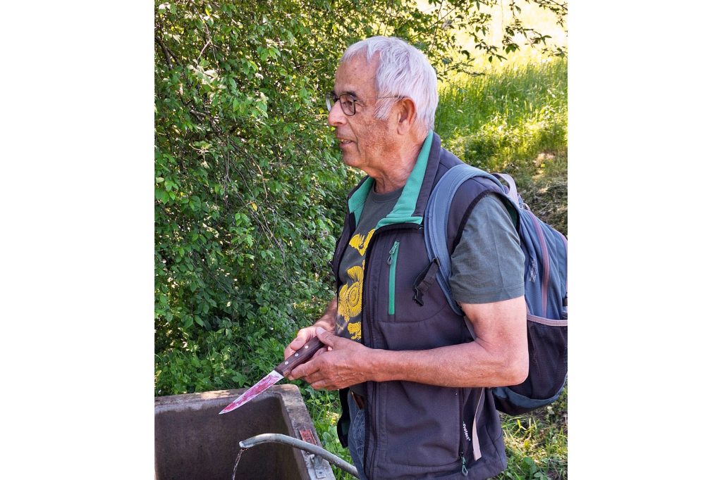 Der Exkursionsleiter mit dem Mordmesser vom Sandbrunnen.