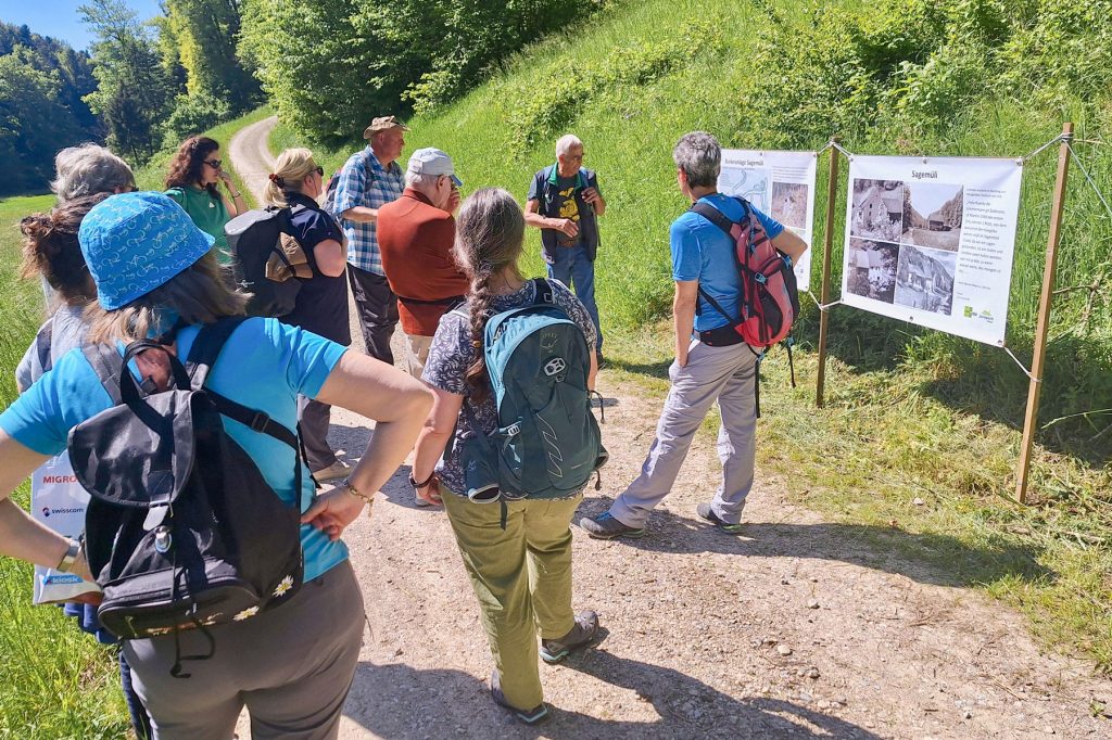 Nach der Bemerkung zum Schimmelreiter im Gättibuech verwies Exkursionsleiter Urs Frei in Linn auf das intakte Ortsbild mit seinen behäbigen, rund 200 Jahre alten Bauernhäusern, dann auf die knapp abgewehrte Störung des Sagemülitals durch geplante Verkehrsvorhaben. Weiter unten brachte Frei botanische Hinweise zu den Orchideenstandorten, zum höchsten Wasserfall des Aargaus, zu den im Zweiten Weltkrieg gebauten Bunkeranlagen und zur Sage­müli an, die allerdings längst verschwunden ist.