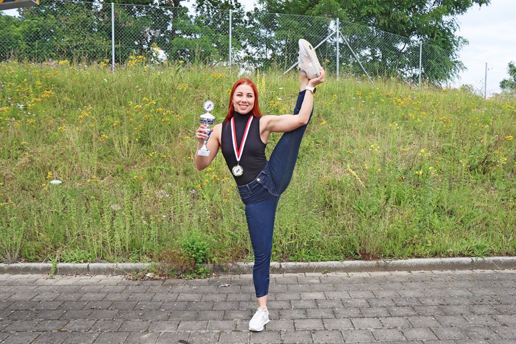 Hoch das Bein! Schweizer Meisterin Moira Menari präsentiert Pokal und Medaille und dazu ihre Beweglichkeit mit der Pose «leg hold». (Bild: chr)