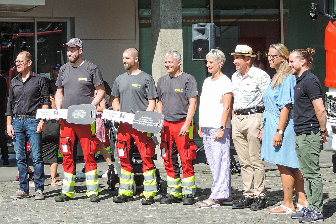 Es ist selten, dass eine Feuerwehr gleich drei neue Fahrzeuge in Betrieb nimmt. Damit steigt der Fahrzeugbestand auf 16 Einheiten. Weil ein Fahrzeug in nächster Zeit altershalber ausgemustert wird, verbleiben immer noch deren 15. Vor einer grossen Zahl an Zuschauenden auf dem Vorplatz der ehemaligen Credit Suisse erklärte der Kommandant Manuel Keller, dass ein Wechsel vom zentralen Fahrzeugstandort zu dezentralen Standorten vollzogen werde. Je ein Tanklöschfahrzeug und ein Personentransportfahrzeug, das mit Einsatzmodulen bestückt werden kann, werden in den Magazinen in Schinznach-Bad und in Umiken stationiert. Bei einem Alarm können die dort wohnhaften Angehörigen der Feuerwehr mit Transportmitteln zum Schadenplatz ausrücken. Je nach Grösse des Ereignisses kann in Brugg stationiertes Einsatzmaterial angefordert werden.