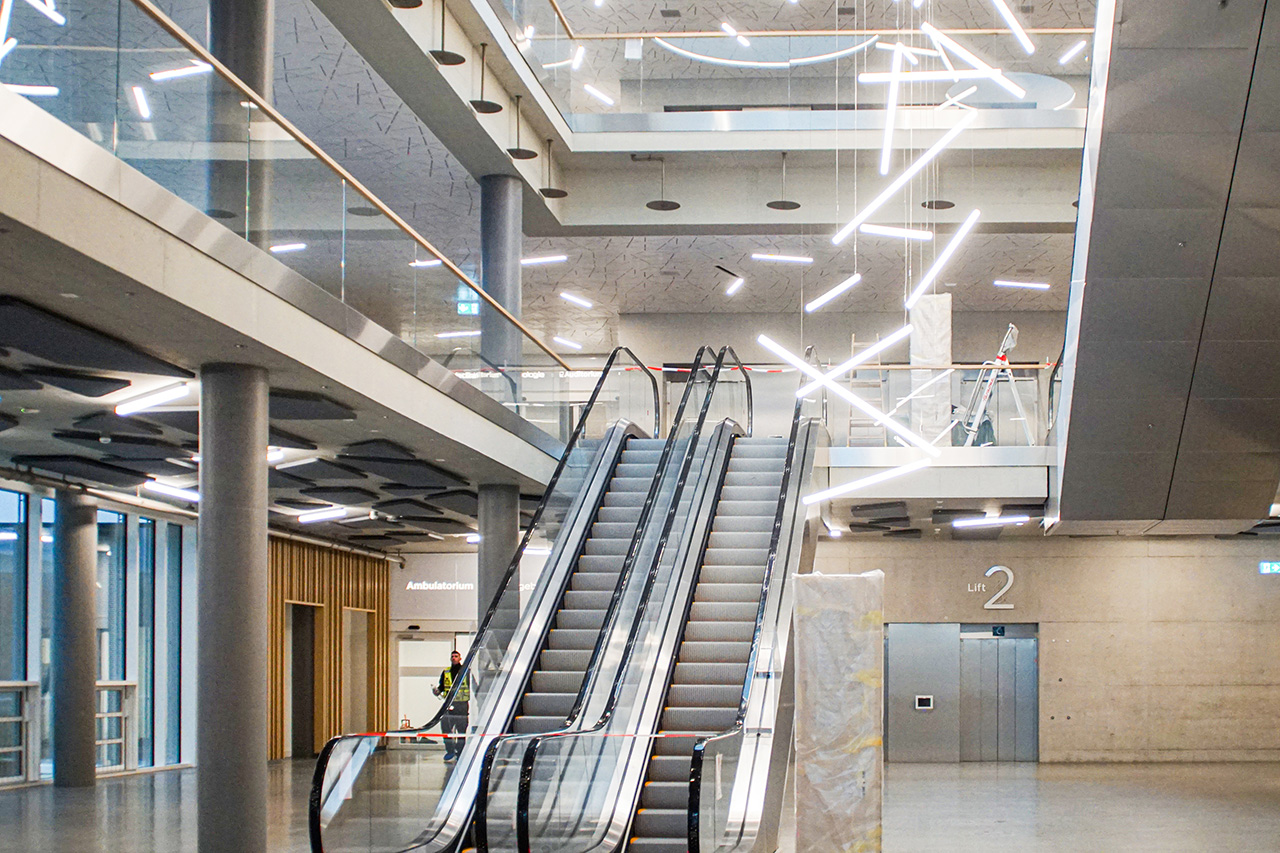 Rolltreppen im Atrium sollen die Lifte im Spitalneubau entlasten. (Bilder: PG)