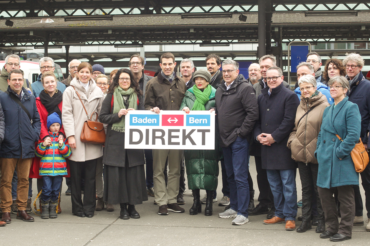 Mit dieser Haltung ist er im Aargau nicht allein. Um sich für den Erhalt der stündlichen Direktverbindung nach Bern einzusetzen, kamen am Samstagmorgen zahlreiche Persönlichkeiten aus Politik, Wirtschaft und Kultur am Bahnhof Baden zusammen. An der Kundgebung nahmen beide Aargauer Ständeräte Marianne Binder-Keller (Mitte) und Thierry Burkart (FDP) sowie Mitglieder des Grossen Rats und des Nationalrats teil. Ebenfalls anwesend waren der Stadtrat Baden sowie zahlreiche Vertreter aus Brugg, darunter Frau Stadtammann Barbara Horlacher (Grüne). Neben politischen Entscheidungsträgern beteiligten sich Vertreter des Paul-Scherrer-Instituts, der Fachhochschule Nordwestschweiz, von Aargau Tourismus sowie aus der Wirtschaft und Kultur an der Aktion.