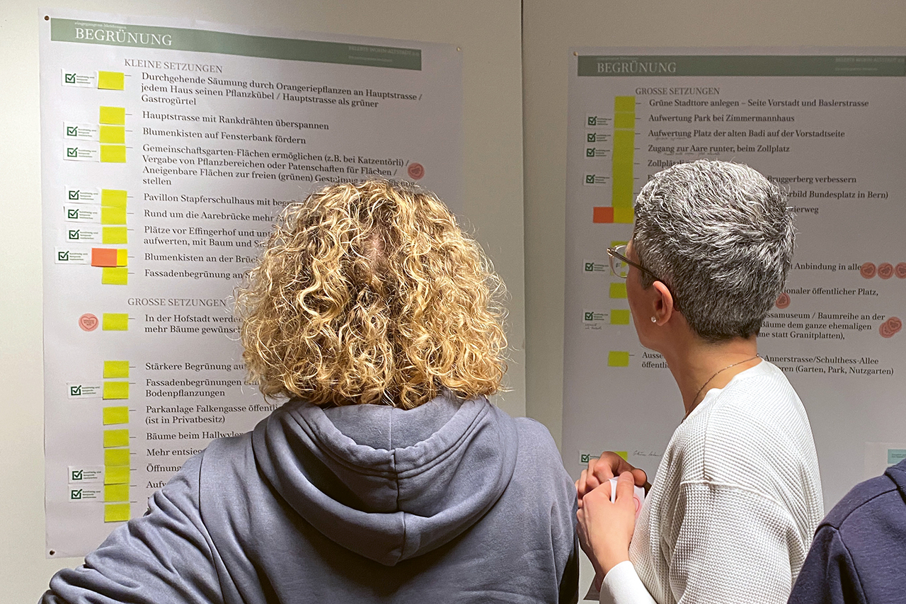 Nach den Gruppengesprächen konnten die Anwesenden diejenigen Ideen, die ihnen besonders am Herzen liegen, als Handlungsschwerpunkte markieren. Ausgerechnet die streitigen Verkehrsansprüche mit zum Teil einschränkenden Massnahmen erzielten am meisten Nennungen, danach folgten Nutzungs- und Veranstaltungswünsche sowie, weniger dezidiert, die Begrünung der Altstadt. Diese Gewichtung hing wohl mit der Zusammensetzung des eher jungen Publikums zusammen. Das Gewerbe war weniger vertreten. Meinungsdifferenzen traten deswegen kaum zutage. Man weiss jedoch aus einer früheren Gesprächsrunde, dass die Verkehrs- und Parkplatzregelung die Geschäftsleute in der Altstadt stark beschäftigt.