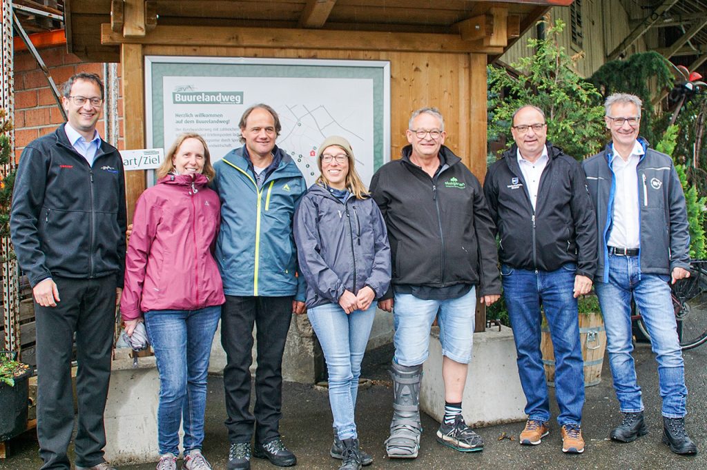Zur feierlichen Eröffnung des etwa 4,5 Kilometer langen Buurelandwegs konnte Christoph Hagenbuch, Präsident des Bauernverbands Aargau, neben Regierungsrat und Landwirtschaftsdirektor Markus Dieth, Spreitenbachs Gemeinderat Edgar Benz und Mitarbeitende des Departements, Landfrauen auch die Landwirtinnen und Landwirte der drei am Projekt ­beteiligten Landwirtschaftsbetriebe willkommen heissen. Wegen des regnerischen Wetters fand die Eröffnung in der hofeigenen Stallbar auf dem Bauernhof Obstgarten statt, wo sich Start und Ziel des Rundwegs befinden.