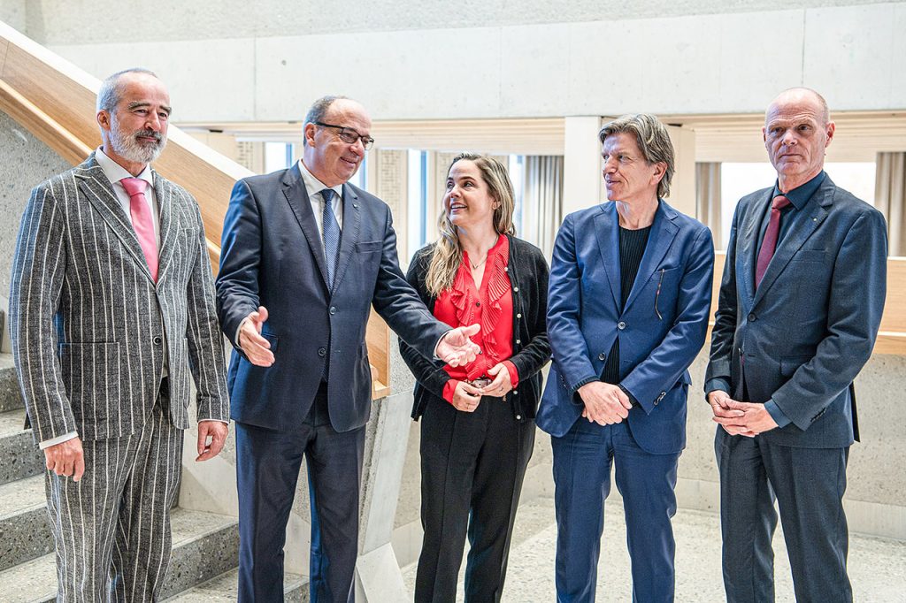 Paul Zübli, Rektor der Kantonsschule Wettingen, die Regierungsratsmitglieder Markus Dieth und Martina Bircher, Daniel Dickenmann, Architekt, sowie Urs Heimgartner, Chef der kantonalen Abteilung Immobilien, freuen sich über den neuen Westflügel des Klosters. (Bild: bkr)