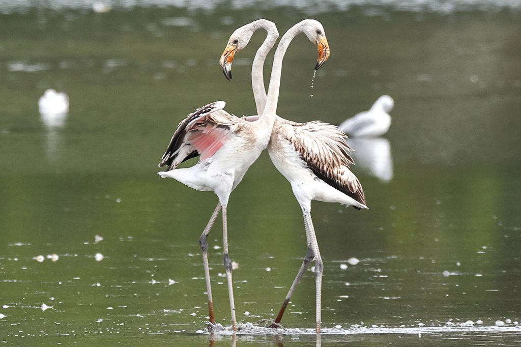 Gleichsam als Kontrastprogramm zu diesen geschäftigen Tätigkeiten bietet sich dem Besucher zurzeit ein ungewöhnliches Bild: Neben allen anderen Wasservögeln sind seit dem 5. September 20 Rosaflamingos zu beobachten. Die grossen Schreitvögel verteilen sich meist über den ganzen Nordteil des Stausees und bringen einen Hauch von Camargue ins untere Aaretal. Es handelt sich durchweg um Jungvögel, das heisst, sie sind in diesem Frühjahr geschlüpft oder in ihrem zweiten Lebensjahr. Deshalb sieht man noch nicht viel Rosa in ihrem Gefieder, wie das bei erwachsenen Rosaflamingos zu erwarten ist. Die Rosafärbung stammt von den roten Salzwasserkrebsen, ihrer Hauptnahrung in Meeresgebieten. Die Jungvögel haben noch ein mehrheitlich braun-weisses Gefieder und dunkle Beine. Nur wenn sie ihre Flügel anheben – beispielsweise bei einem kurzen «Tanz» mit einem Artgenossen –, lassen die zweijährigen Vögel ein blasses Rosa am Unterflügel aufblitzen.