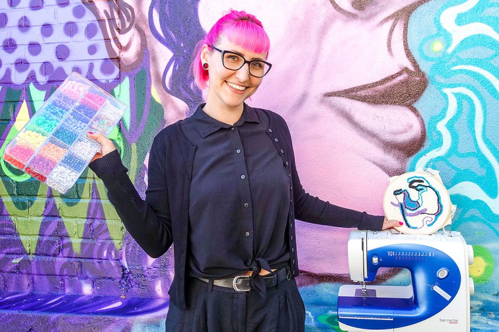 Michaela Ortlepp vom Piccadilly macht mit bunten Perlen und einer Näh- maschine Lust auf die kreativen Workshop-­Wochen. (Bild: mg)