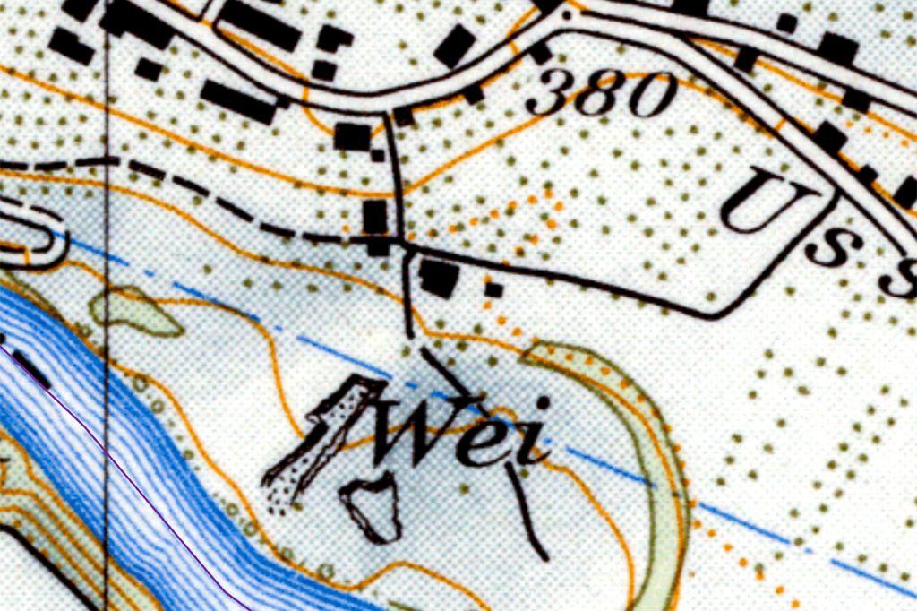 Die Landeskarte von 1955 zeugt von der maximalen Ausdehnung der beiden Abbaustellen von Kalktuff in der «Wei» südlich der Fabrik. In der nächsten Ausgabe des Kartenwerks von 1964 fehlt jede Spur der Isolierbaustein-Produktion. (Bild: Swisstopo | AGIS)
