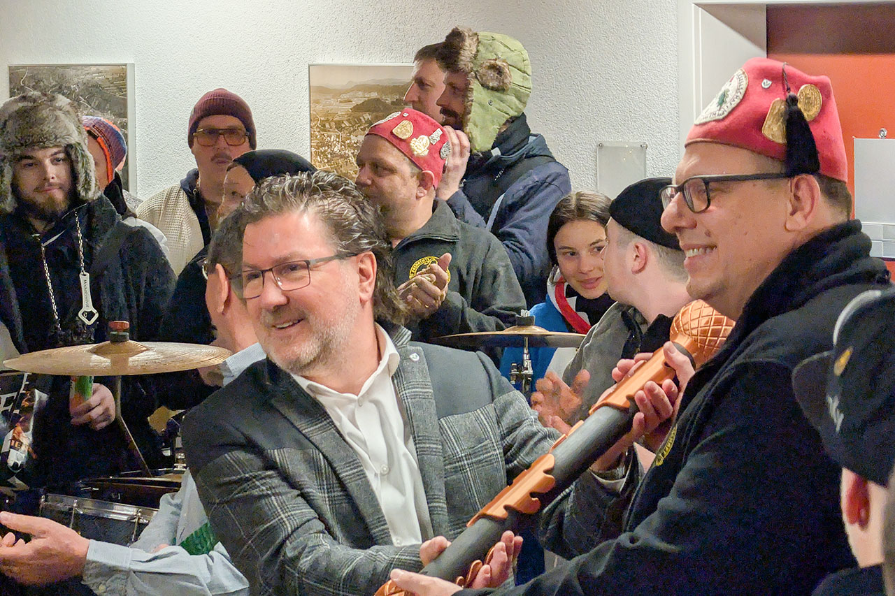 Während es die Guggen und Fasnächtler wieder nach draussen zog, traf sich der Rat der Fasnachtsgesellschaft an der neuinstallierten Shotbar im Gemeindehaus, bevor man gemeinsam das neue Dienstbüro des Gemeindeammanns bezog.