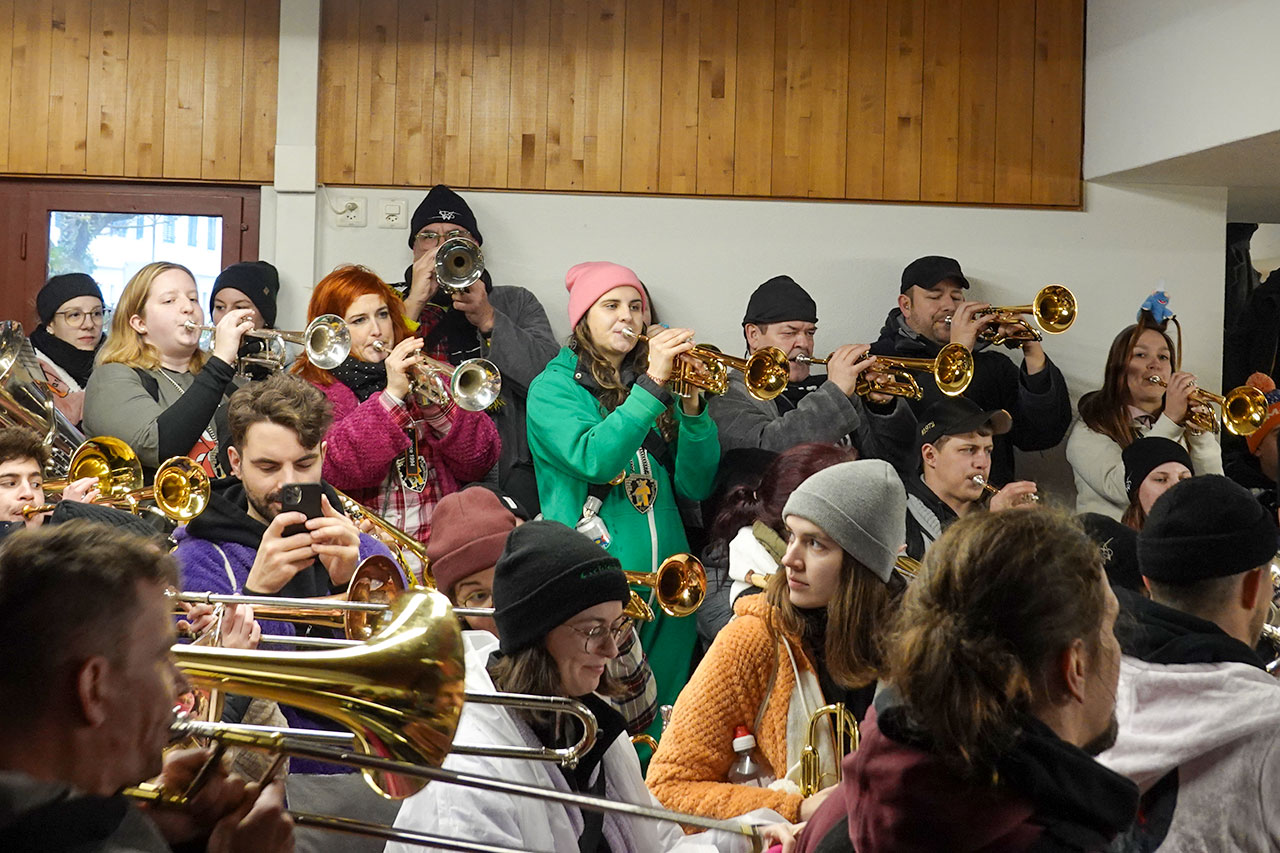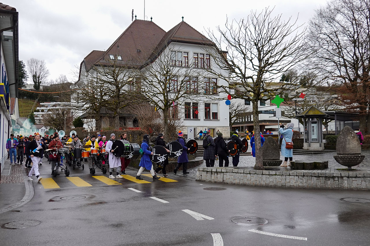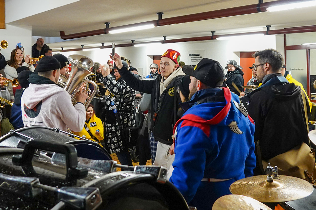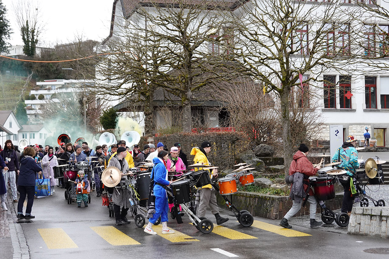 Im Anschluss an das Mini-Konzert wechselte man die Strassenseite und brachte nacheinander die zahlreichen fahrbaren Schlagzeuge und Trommeln in das Würenlinger Gemeindehaus. Selbst dicht gedrängt wurde der Platz im Erdgeschoss des Gebäudes knapp – umso lauter erklang dafür die Guggenmusik. Ohrenschützer gab es hier fast ausschliesslich nur bei den kleinsten Teilnehmern und Teilnehmerinnen.