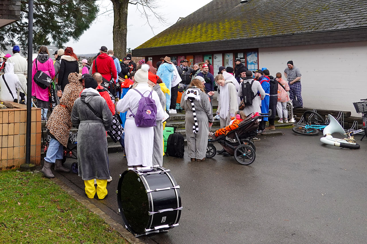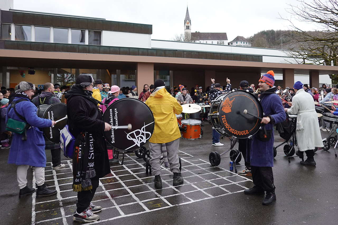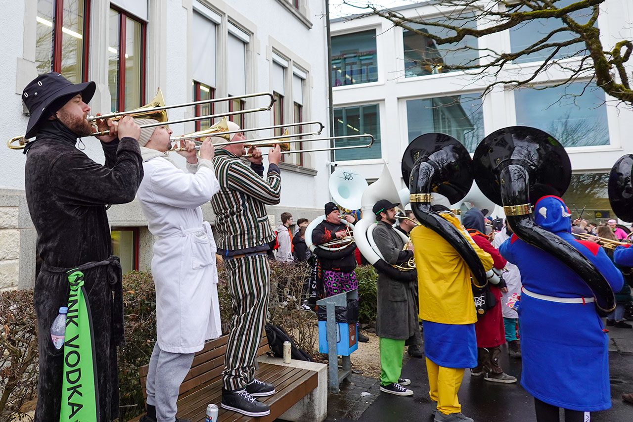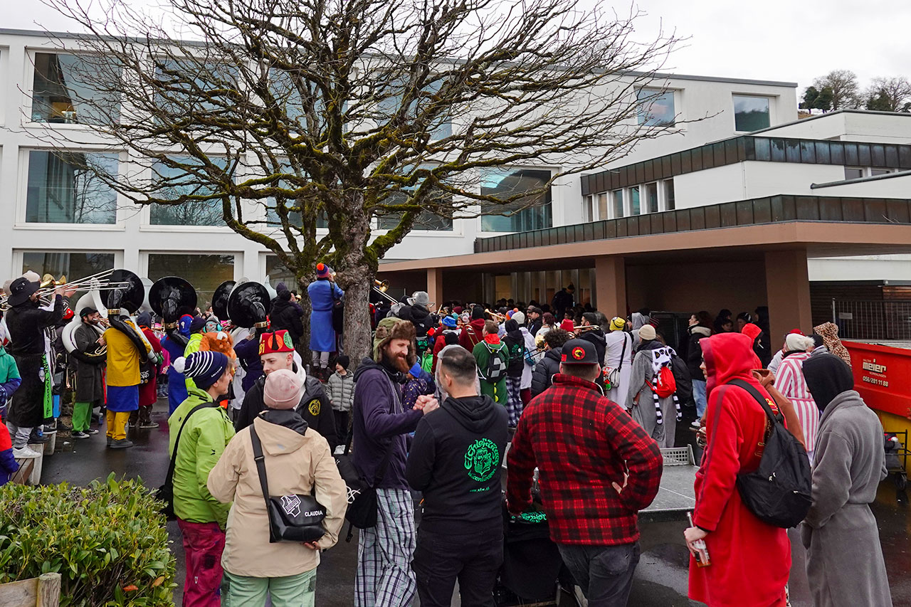 Würenlingen – Begleitet von Rauchpetarden zogen die Guggen, Fasnächtler und Fasnächtlerinnen in Würenlingen am Donnerstagmorgen, 12. Februar, gemeinsam zum Schulhausplatz. Neben den zahlreichen Kostümierten und Musizierenden waren auch viele Schulkinder auf dem gut gefüllten Areal, um das Spektakel zu begutachten. Bis 9 Uhr erklangen bekannte Hits wie «Footloose», während man bereits in bester Fasnachtslaune das eine oder andere alkoholische Getränk konsumierte. Und zumindest für den Moment blieb es von oben trocken.