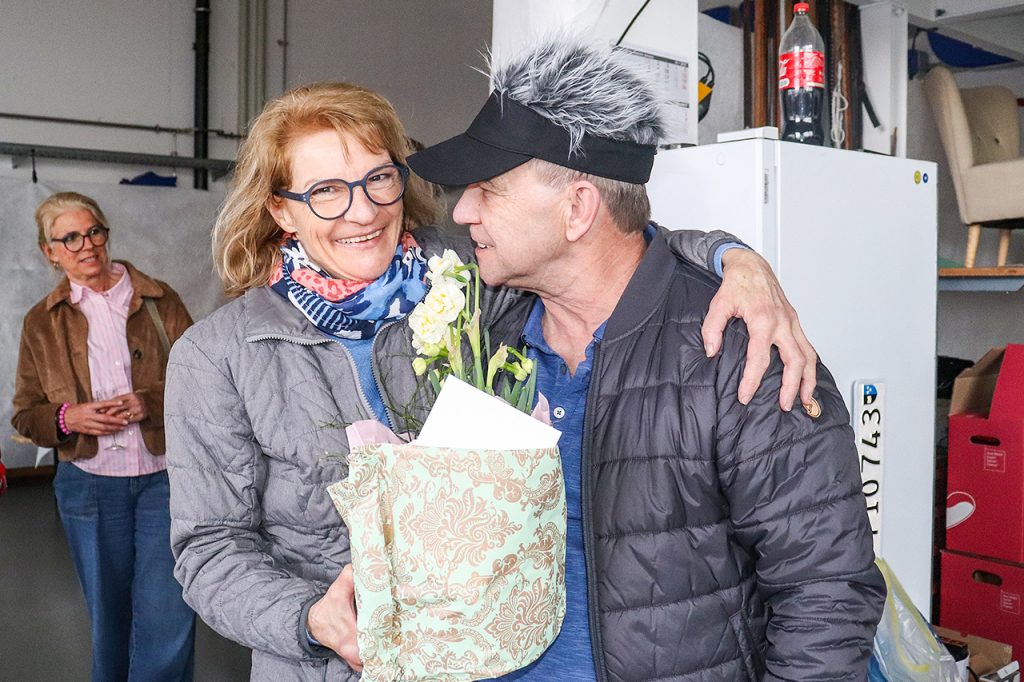 2001 zog die Wäscherei ins BAG-Areal in Turgi, und die Mitarbeitenden wurden zu einem kleinen, eingeschworenen Team. Im Jahr 2009 wagte Anita Umiker die Expansion nach Lenzburg und eröffnete dort eine Filiale. Drei Jahre später wandelte sie diese in ein Depot um, um die Wege zu verkürzen und die Logistik zu vereinfachen. 2016 fand Anita Umiker in Gebenstorf ein neues Zuhause für den Betrieb. Mit mehr Platz, modernen Abläufen und einem motivierten Team, das inzwischen auf 18 Mitarbeitende angewachsen war. Unterstützung erhielt sie mehrere Jahre lang von Tochter Sabine und ihrem Partner Hausi Siegenthaler, die bei Büroarbeiten, bei der Eventplanung sowie in der Produktion mit anpackten. «Er half bei der Suche der neuen Räumlichkeiten, richtete diese ein und organisierte den Wäschereiumzug ohne Produktionsunterbruch», erinnert sich Anita Umiker. «Und er war mein Retter in der Not, wenn eine Maschine ausstieg oder ein Chauffeur ausblieb. Auch half er aktiv beim grossen Abschiedsfest mit.»