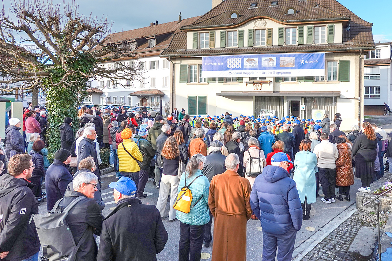 Lengnau – Am vergangenen Donnerstag lud die Stiftung Doppeltür nach Lengnau zum symbolischen Spatenstich für den Umbau des gleichnamigen Begegnungszentrums. Schon vor dem offiziellen Beginn um 17 Uhr versammelten sich zahlreiche Gäste und Interessierte auf dem Dorfplatz. Vor der Synagoge wurde ein Festzelt mit Rednerpult aufgebaut, und das Zentrum Doppeltür hatte seine Türen geöffnet. Neben Regierungsrat Dieter Egli hatte sich aus der Politik alt Bundesrätin Doris Leuthard angekündigt.
